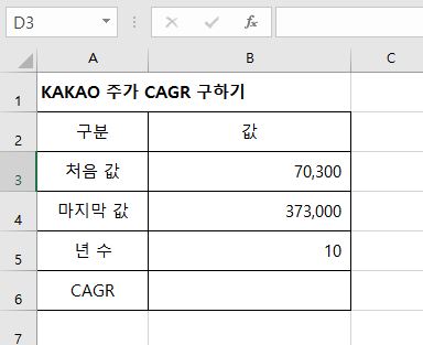2. CAGR 값에 아래와 같이 CAGR 공식을 접목한 계산식을 넣어줍니다.