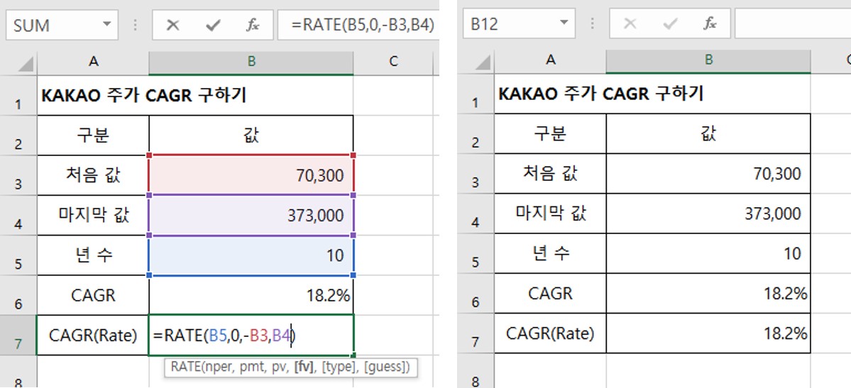4. 또는 rate 함수를 이용해도 됩니다. rate 함수를 이용한 CAGR 계산 방법은