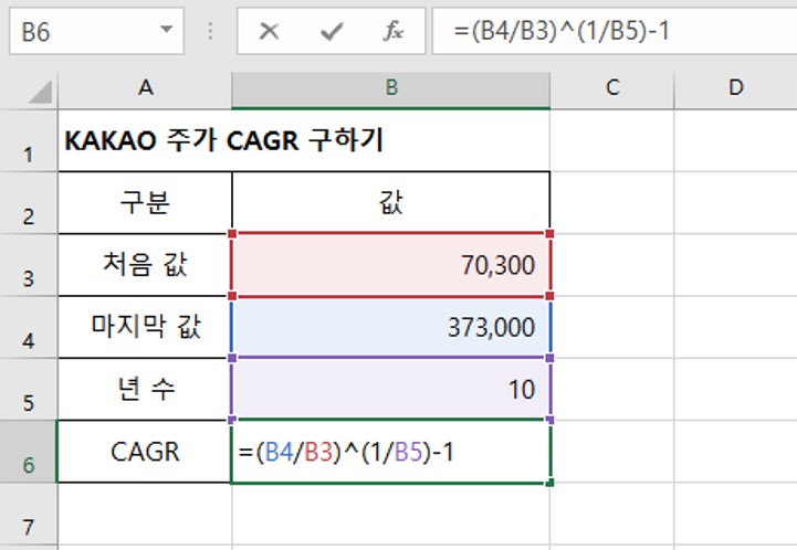 2. CAGR 값에 아래와 같이 CAGR 공식을 접목한 계산식을 넣어줍니다.