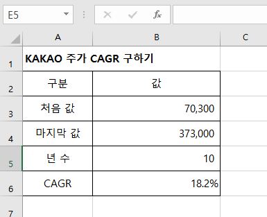 이 값을 CAGR 공식에 대입해 보면 아래처럼 되겠네요.